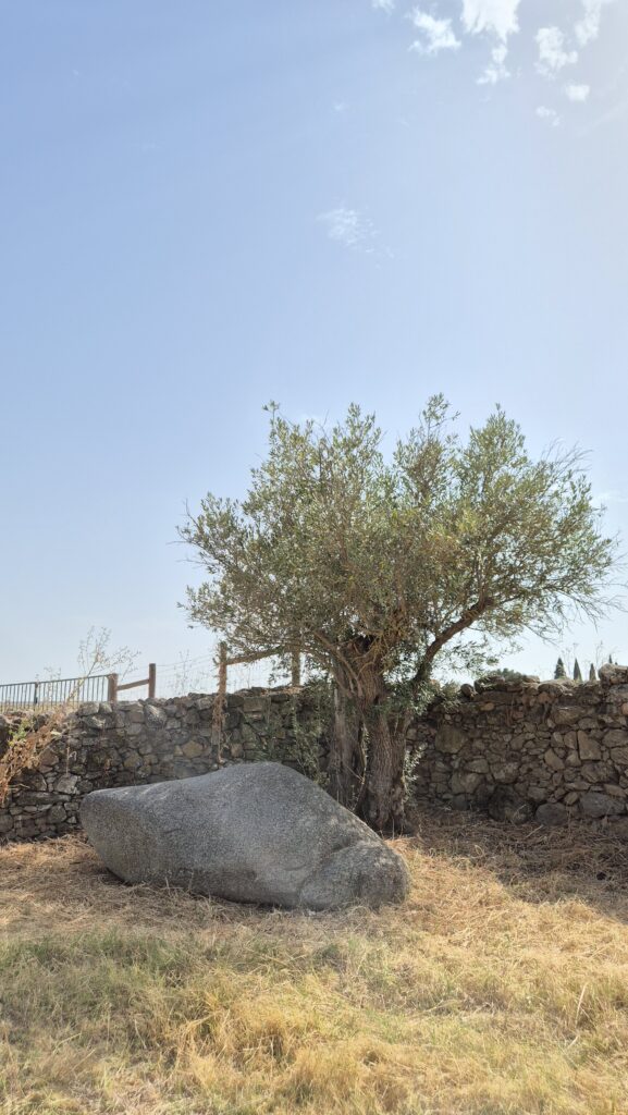 O nome Pedra da Mãe vem de uma pedra de granito que temos na propriedade. Uma pedra grande, com um formato curioso, quase a parecer uma soca de madeira. Atrás dela, uma oliveira que sempre lá esteve.